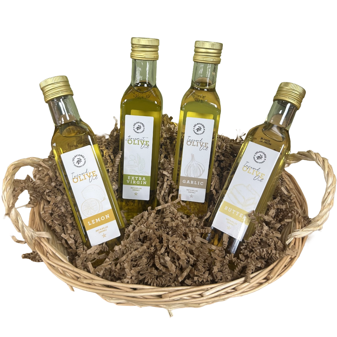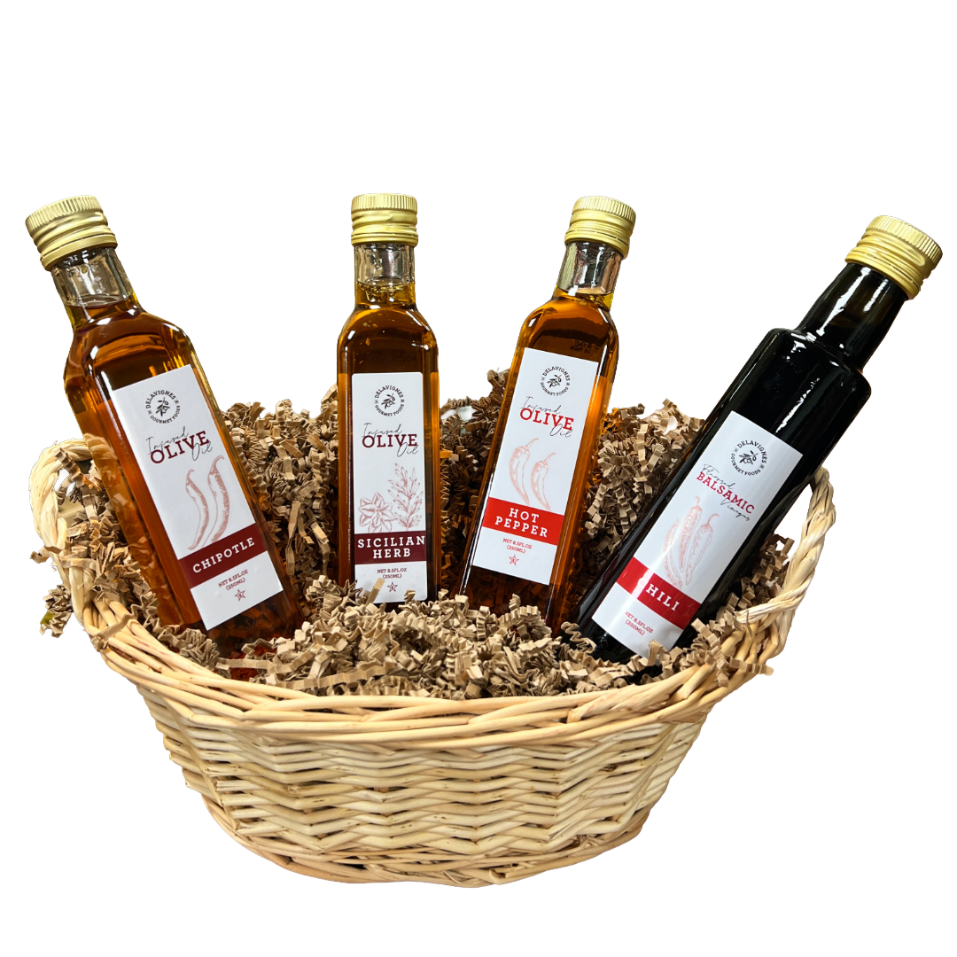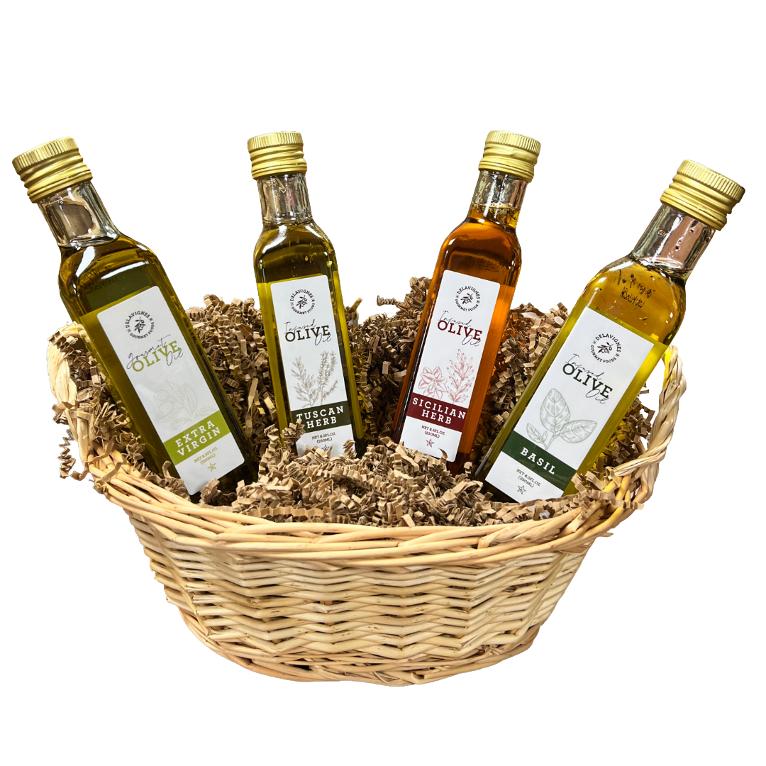 Surprise someone special with a gift that delights the senses and elevates every meal. Each basket features four award-winning bottles (250ml / 8.5 fl oz each) of our most beloved olive oils and balsamic vinegars—hand-selected for their flavor, quality, and versatility.