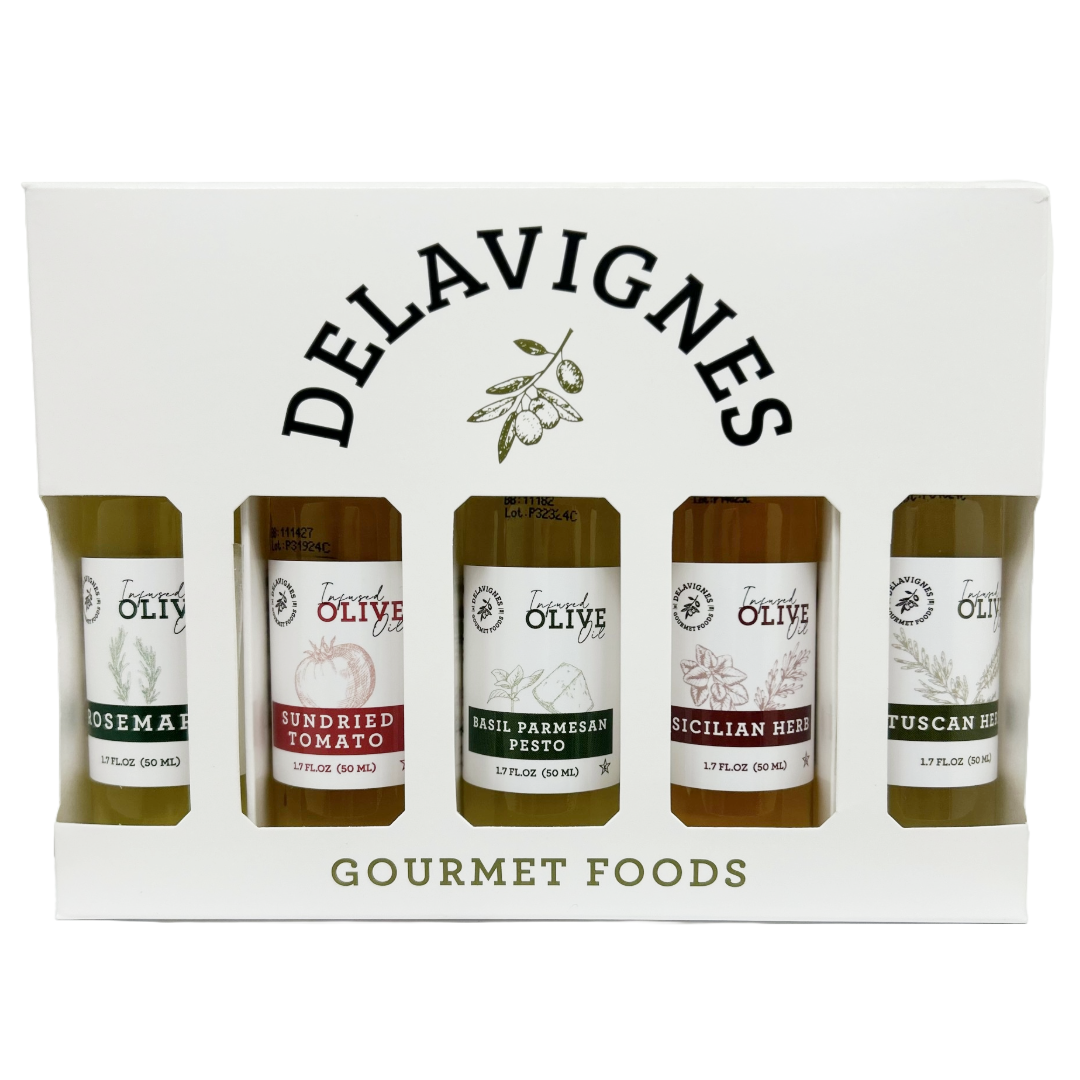 5 personal size (50 ml or 1.7fl oz) award winning olive oil, balsamic vinegar, or both; carefully curated and displayed in glossy display gift boxes.