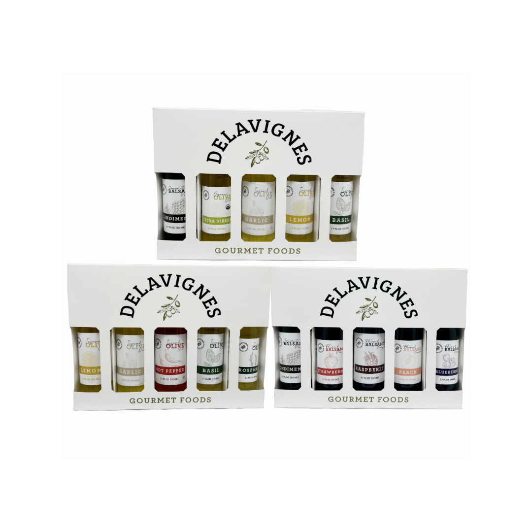 Classic Combo- a combination of olive oil & balsamic including Extra Virgin Olive Oil, Lemon Infused Olive Oil, Basil Infused Olive Oil, Garlic Infused Olive Oil, and Balsamic Vinegar Condimenti.